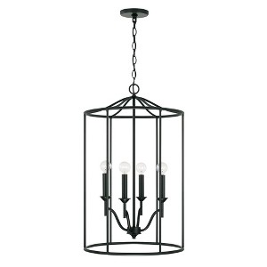 The sharp lines and artistic arches of the Peyton 4-Light Foyer are timelessly transitional. The muted tone of the Matte Black finish allows the silhouette to take center stage. APPLICATIONS: Perfect for use in foyers, hallways, stairways and kitchen. This cylindrical foyer features a clean, simple design in matte black finish EASY TO INSTALL: Replacing an existing fixture is easy with the included instructions and can be finished in as little as 15 minutes with a few simple hand tools. VERSATILE: Dimmable and LED/CFL/Incandescent compatible, uses four 60-Watt (max) E12 candelabra base bulbs (Not Included) DIMENSIONS: Adjustable Height (from 32.5 inch to 155 inch), 18 inchW x 29 inchH; includes 10' of chain, 15' of wire RELIABLE: Includes 1-Year Limited Manufacturer's Warranty. Warranty: 1 Year Room Recommendation: Foyer/Entryway/Kitchen/Hallway/Stairway/Home Office/Living Room/Dining Room/Bedroom Mounting Direction: Up Canopy Included: Yes Canopy Diameter: 5 x 0.75