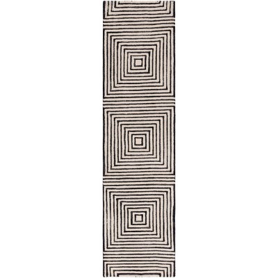 Elevate your home with the timeless sophistication of our Hand Tufted Runner Rug. Crafted with precision and care in India, this 2'-3" X 9' rug boasts an elegant black and ivory color palette that will complement and enhance any decor. The pattern, a harmonious blend of geometric shapes and cultural motifs, adds a touch of cultural richness to any hallway or narrow space.