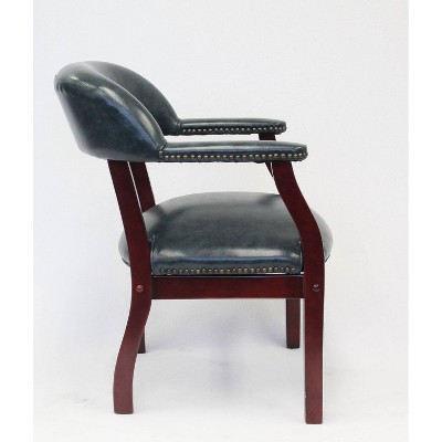 The lustrous Ivy League Executive Captain's Chair, upholstered in burgundy is designed in a gorgeous and easy to clean vinyl with a four leg mahogany base that utilizes hooded brass castors for class and functionality. This chair adds an air of professionalism and regality to any room or office, while maintaining maximum comfort for anyone using it. It is designed with a fixed height arms, cozy padded arm rests and offers a maximum weight capacity of 275lbs.