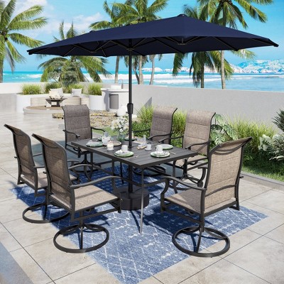 Captiva Desighttps 8pc Patio Dining Slat-top Rectangular Steel Table & Padded Sling Swivel Chairs & Market Umbrella