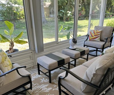 Cushion covers feature a zipper for easy removal and are machine washable.
