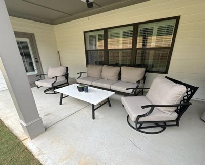 Beautiful patio set. It is very comfortable and fairly easy to put together. It dries fast after rain, and any stains wipe off easily with just water and a cloth. The swivel chairs are our favorite?so relaxing. I highly recommend.