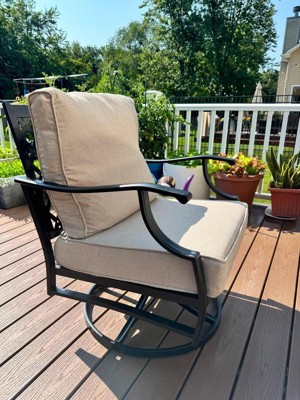 Firm cushions. Chairs swivel easily. It is just what the patio needed, easy to assemble, love the material and the quality.