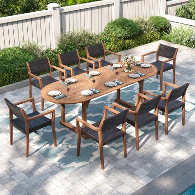 - Complete 7-Piece Dining Set: This versatile set includes a spacious dining table and six comfortable armrest wicker chairs, offering ample seating for your outdoor gatherings.