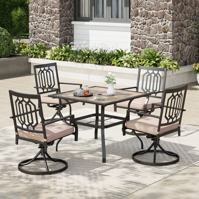 The 360°swivel chairs, with thick cushions, provide a wonderfully cozy seating experience. These modern patio arm fixed chairs feature STACKABLE design and unique perforated backs. This durable set seamlessly blends style, function and durability, making it the perfect choice for your outdoor dining needs.