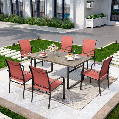 - Complete 7-Piece Dining Set: This versatile set includes a spacious dining table and six comfortable armrest sling chairs, offering ample seating for your outdoor gatherings.