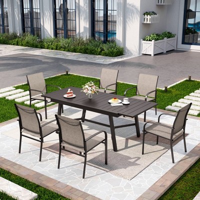 [CAPTIVA DESIGNS] Upgrade your outdoor dining with our 7pc Patio Dining Set, which features a premium metal frame and wood-like tabletop with a 1.57" umbrella hole. The table offers a rustic look with a durable faux woodgrain finish, a slat tabletop with a steel reinforcement ring beneath its edges.