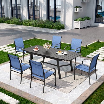Captiva Designs 7pc Patio Dining Set with Flat Wood-look Rectangle Steel Table & Blue Sling Fixed Chairs