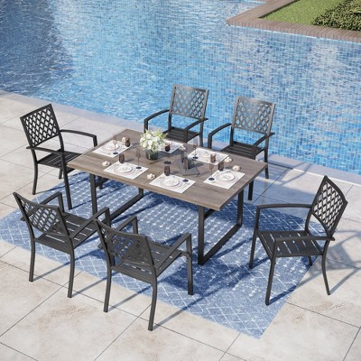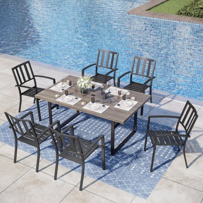 Elevate your outdoor dining experience with our 7pc Patio Dining Set. The premium metal and faux woodgrain finish provide a rustic yet durable look. The table includes an umbrella hole for added convenience. These modern patio arm chairs feature STACKABLE design and unique perforated backs. It is designed to make your dining moments memorable. Its sturdy design, crafted with E-coated and powder-coated steel frame, makes the set perfect for all your outdoor dining needs.