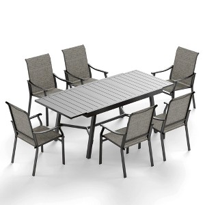 Paired with ergonomic breathable sling patio chairs featuring extra-wide 19.7" seats, ergonomic backrests, and wide armrests, this set ensures all-day comfort. Made for all-weather use, the durable UV-resistant Textilene fabric allows for easy maintenance, with each chair supporting up to 300 lbs. Enjoy stylish and comfortable outdoor moments with this versatile dining set!