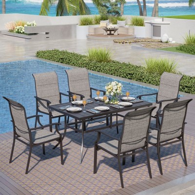 Captiva Designs 7pc Patio Outdoor Dining Brown Wood-look Rectangle Steel Table with Umbrella Hole & Brown Textilene Fixed Chairs