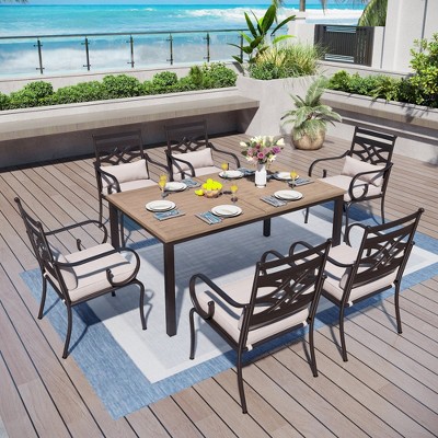 Captiva Designs 7pc Patio Slatted Top Steel Dining Table & Fixed Chairs with Seat Cushions and Waist Pillows