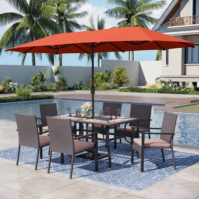 Captiva Designs 8pc Outdoor Rectangle Steel Dining Table & Stackable Metal Chairs & Red Umbrella