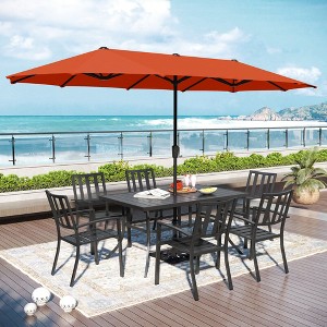 - Complete 8-Piece Dining Set: This versatile set includes a spacious dining table, six comfortable armrest metal chairs, and 1 red market umbrella, offering ample seating for your outdoor gatherings.