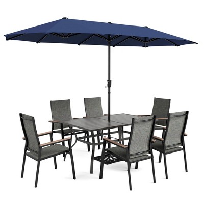 Captiva Designs 8pc Patio Rectangular Steel Dining Table & Fixed Sling Chairs & Beige Umbrella