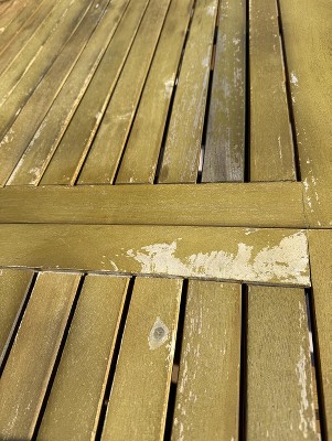 We purchased this table and chairs this June, and over the summer the table has turned greened, peeled, and warped. It was definitely not worth the price tag, and seems almost unusable for next season.