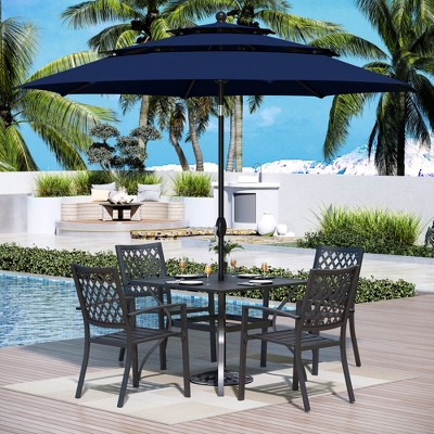 The breathable Padded Blue sling chairs swivel 360 degrees, adding convenience and comfort. U-curve armrests and a sturdy steel frame provide stability, and rust resistance ensures long-lasting use. Crafted from E-coating and powder-coated steel frame, this durable set seamlessly blends style, function and durability, making it the perfect choice for your outdoor dining needs.