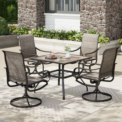 Captiva Designs 5pc Patio Wood-look Square Dining Table with Umbrella Hole & Textilene Swivel Chairs