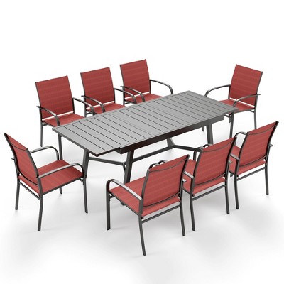 Captiva Designs 9pc Outdoor Patio Slat-top Rectangle Metal Dining Table & Breathable Textilene Chairs