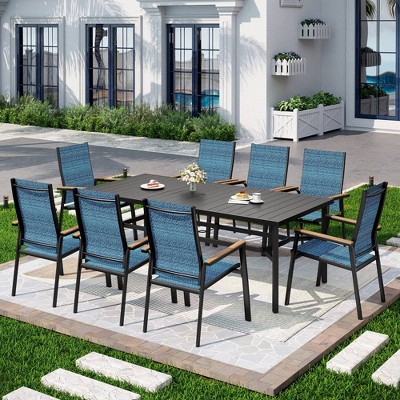 Captiva Designs 9pc Patio Slat-top Square Metal Dining Table and Padded Sling Swivel Chairs