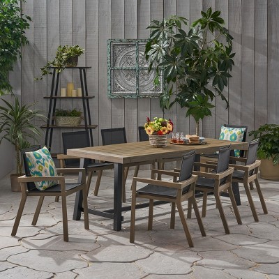 Christopher Knight Home Claude Outdoor Mesh and Acacia Wood 9 Piece Dining Set with 79" Dining Table