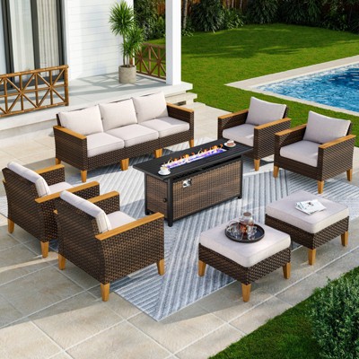 Elevate your family gatherings with our 9-piece outdoor furniture set. Crafted from durable hand-woven rattan, it effortlessly withstands changing weather. The brown rattan paired with beige/blue cushions not only looks stylish but also provides a cozy seating experience. Ideal for poolside, garden, or courtyard settings, our outdoor furniture is your perfect companion for countless enjoyable moments.