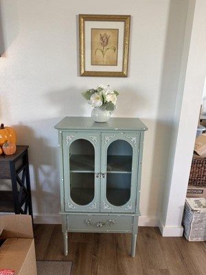- Chic Vintage Style: Featuring soft mint color, floral patterns, and distressed finish, this piece adds elegant shabby charm to any room. Its clean lines and decorative knob enhance its classic look.