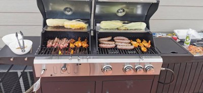 It's really sturdy compared to my old charcoal grill. It has a charcoal side, a gas side with a 3-burner grill, and a side burner too. I cooked on both sides at once, and everything turned out delicious! I really love the side table and the hooks—they're great for keeping my tools handy. And the crank handle, it's super easy to adjust the heat for the charcoal. I don't have to open the lid anymore to manually adjust the coal pan, so I don’t risk getting burned or needing pot holders!