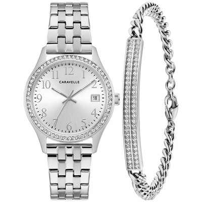 Caravelle designed by Bulova Classic Crystal Accented 3-Hand Date Quartz Watch and Bracelet Gift Set