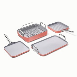 Clean cooking gets squared away with Caraway’s non-toxic Squareware Set. Featuring our signature non-stick ceramic coating, these four spacious pans are perfect for recipes that need a bit more room. Sets include complimentary magnetic organizers to keep your cabinets tidy.
