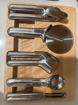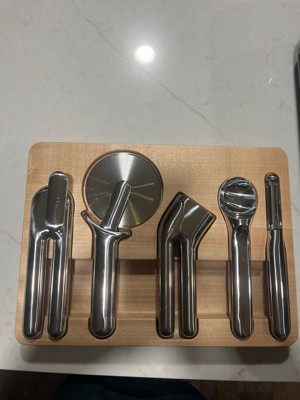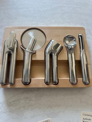 Caraway Home 6pc Kitchen Gadget Set: Stainless Steel Utensils, Includes Peeler, Pizza Cutter, Can Opener, Silver Holder