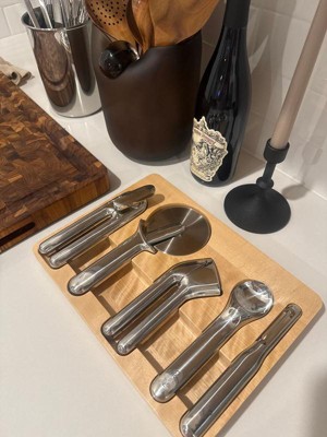 Crafted with non-toxic stainless steel, these 5 essential gadgets combine form & function. With no plastic or silicone, this first-ever premium line of kitchen tools is durable and easy to use. The included organizer, made of 100% FSC-certified birch wood, fits away neatly. Say goodbye to the junk drawer.