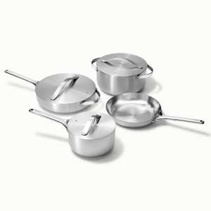 The cleanest way to take on sizzles & sears with ease. Caraway’s lightweight Stainless Steel Cookware Set includes everything you need for healthier cooking at higher temperatures, plus complimentary pan & lid storage included.