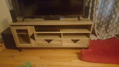 A: Dimensions: 25.39" High x 55.51" Wide x 15.67" Deep; Left Upper Close Shelf: 8.58" High x 14.92" Wide x 11.81" Deep; Left Lower Close Shelf: 8.58" High x 14.92" Wide x 14.92" Deep; Right Upper Open Shelf: 4.92" High x 38.74" Wide x 14.6" Deep; Right Lower Open Shelves: 4.88" High x 19.07" Wide x 14.6" Deep; Drawers: 3.74" High x 13.19" Wide x 16.89" Deep; Legs: 5.51” High