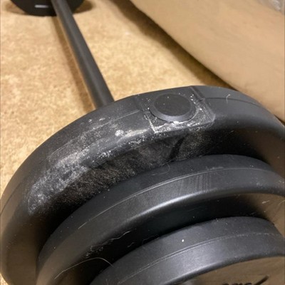 This is a great weight set, looks exactly as described and has the correct weight amount. The bar has a nice weight and good cushion. There is one part where the bar screws together that had some of the padding lifting up (see photo). This was not a big deal to me as I just trimmed off the extra. The outside of a couple of the weights were dusty. Overall decent set though, I’d rate it a 4/5. With that being said, I took off two stars for the horrific nightmare that was the delivery process. I ordered this to help me prepare for my upcoming wedding and was excited to start lifting again! I ordered this item on December 31st and it was initially scheduled to get to me January 6th, awesome, what a quick turn around! Then it was delayed to Jan. 8th due to weather, no big deal I don’t mind waiting a week. However, the package continued to be delayed day after day after day and I only received my package today, more than 2 entire weeks after the original scheduled delivery. This was only after I reached out to FedEx twice and Target 3 times. I’m not a monster, I understand the people on customer service lines are not responsible for or the cause of this delay. However, my Target customer service experience was poor at best, with one person even ending the chat abruptly before answering my question. I was met with the same response each time to “just give it a few days.” I reached out to FedEx first, who told me to reach out to Target, who was no help. It wasn’t until I reached out to FedEx for a second time, truly digging in, that they finally contacted the correct location and found my package. When I received the package, it was torn to shreds (see pictures). The holes left in this box were big enough for pieces to fall out of my already 2 week late package. Luckily, everything was intact (thank GOODNESS) so I don’t have to live through this shipping mess again. Overall super disappointed with how the package came and the length of time it took to deliver, and especially disappointed in Target’s customer support. I understand this was likely an issue on FedEx’s end, but I was disappointed in the dismissal from Target when my $90 package was missing.