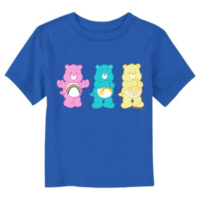 Strut your stuff with this stylish new youth t-shirt that is perfect for every occasion! Featuring your five favorite bears who show off belly badges with a four-leaf clover, a heart, a shooting star, a rainbow, and a sun.