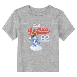 Caring is what counts, especially when it comes to caring about your favorite teddy bears with the officially licensed Care Bears Team America Baseball Grumpy Bear Care Bears Toddlers' Graphic T-Shirt. From cuddly stuffed bears to tv shows and movies, the Care Bears have it all! Grab yourself a Care Bears tee today and spread a little joy in the magical realm of Care-a-Lot! Grumpy Bear is featured in a fun artistic design as he tosses a softball alongside the text "Team America 82" in red and white print across the front.