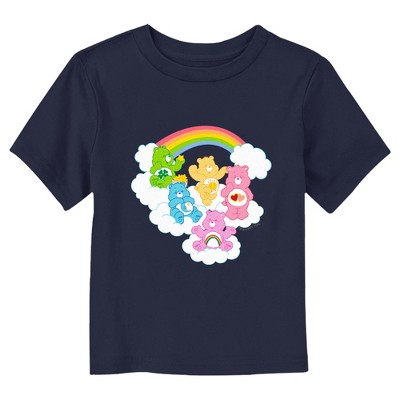 Caring is what counts, especially when it comes to caring about your favorite teddy bears with the officially licensed Care Bears Bedtime Bear Time to Party Rainbow Care Bears Toddlers' Graphic T-Shirt. From cuddly stuffed bears to tv shows and movies, the Care Bears have it all! Grab yourself a Care Bears tee today and spread a little joy in the magical realm of Care-a-Lot! Your favorite Care Bears including Bedtime Bear, Cheer Bear, Birthday Bear, Good Luck Bear, and Sweet Dreams Bear are featured on a fluffy cloud, while they are encircled by the red text "Time to Party" across the front.