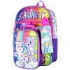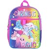 The backpack has a vividly colored design of multiple characters and the saying Sharing Is Caring. It has 1 outer pocket,1 large main compartment, and side mesh pockets.