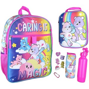 GREAT Carebears Backpack and Lunch bag set. This 5 PC Carebears set comes with a backpack, a detachable insulated lunch bag, a water bottle, a sticker pack to customize your bottle, and a metal carabiner. The backpack has a vividly colored design of multiple characters and the saying Sharing Is Caring. It is made of durable polyester and comes with adjustable padded shoulder straps. The detachable lunch tote has a padded top carrying handle. The carabiner clip keeps the water bitter on the bag but can be detached and used elsewhere. This set is perfect for traveling and carrying your books or binders. It will make an excellent gift for birthdays, Christmas, or any other special occasion.