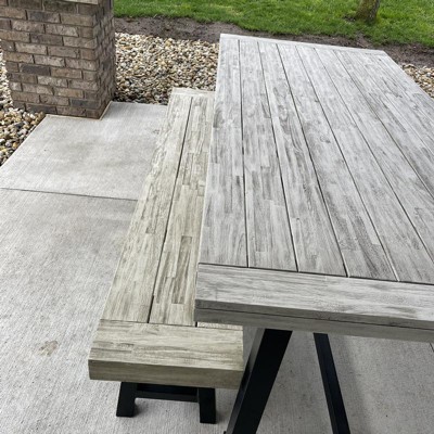 We love this table! Perfect for our patio and easily can hold 3-4 children on each side, we plan on adding a chair on each end for more seating. Very sturdy and wee love the faux wood tops. Took us about an hour to get it together, unboxing was probably the longest part of the process.