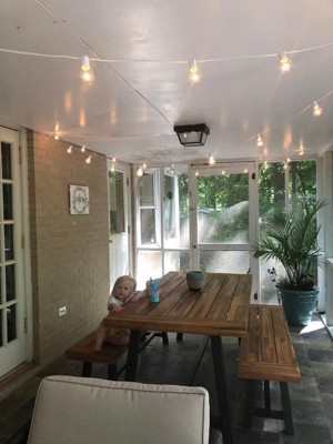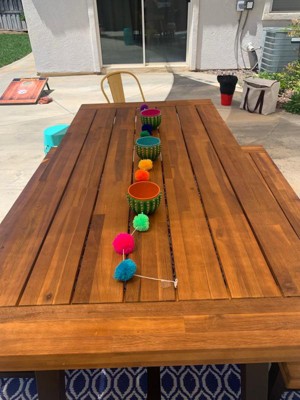 The patio table was easy to assemble. If you have a drill attachment it’s even faster and easier. We haven’t had the table long enough to test it’s durability through the different seasons, but so far it’s beautiful. The wood would probably be easy to seal or stain if needed.
