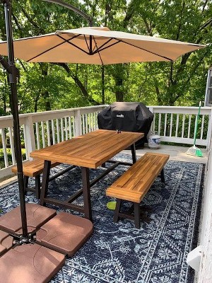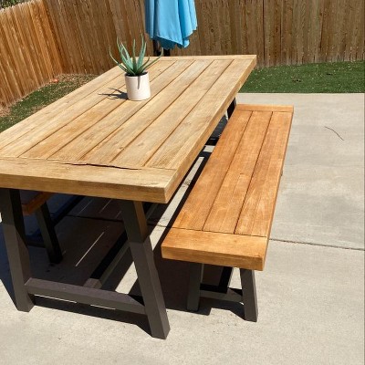 A: The benches and the table frame have held up well. However, the thinner table top slats have warped as we left it out in the snow and rain. We need to put a big board under the table cloth or drink holders will tip over. Also, the finish will peel/fade in the sun but we like the weathered look.