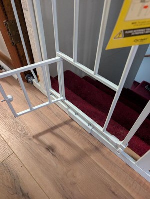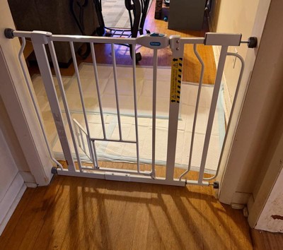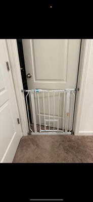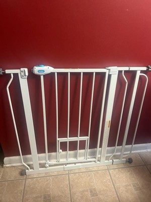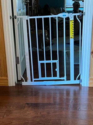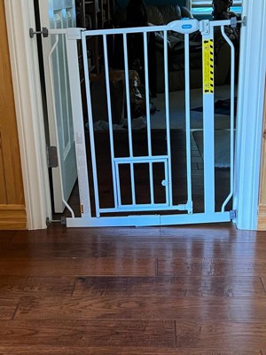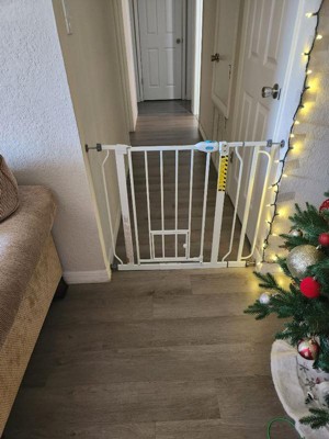 An essential tool for homes with pets, the Carlson Extra Wide Walk-Thru Pet Gate in white with a Small Pet Door is a convenient, chew-proof solution for containing and protecting both your pet and home. Designed with an all-steel construction, this sturdy pet gate ensures durability while providing ease of use. It’s the perfect solution for busy pet owners who need to pass through the gate frequently while maintaining a secure boundary for their pets.