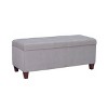 - This storage ottoman features a Gray microfiber upholstery and tufted, padded seat, with a safety hinge on the lid.
