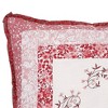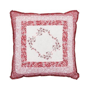 This soft and lovely square pieced decorative pillow coordinates with the Caroline Bedspread. The beautiful center of this pillow has embroidered red floral scrolls on white that echo the embroidery of the bedspread. Pieced lighter red floral fabrics from the top of bed design frame the embroidery in a charming border pattern. A light red floral print from the front design creates the reverse.