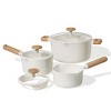 Enjoy everyday versatility with the Carote 21-Piece Ceramic Nonstick Cookware Set in cream white. The collection includes 2 skillets, 2 saucepans with lids, a sauté pan with lid, a large stock pot with lid, a steamer, plus accessories like trivets, utensils, and pan protectors. Built for healthy cooking, the PFAS-free ceramic coating offers a glossy, non-toxic surface that delivers smooth food release and easy cleanup. A dual-size silicone strainer lid makes draining simple with fine- and wide-mesh sides for different foods. The full-spray base distributes heat evenly across stovetops—including gas, induction, glass, and halogen—while simplifying cleaning. Wood-like handles are ergonomically designed for a secure, comfortable grip, and the cream white finish brings a modern, sophisticated look to any kitchen. After meals, this Carote set is dishwasher safe for quick convenience.