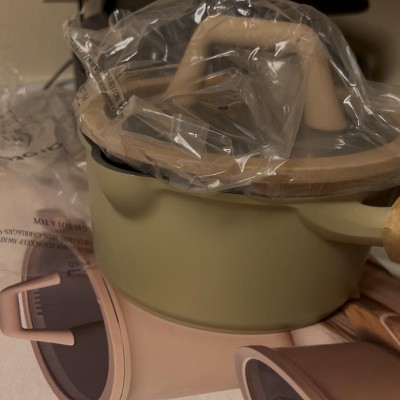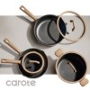 Simplify mealtime with the Carote 9-Piece Nonstick Cookware Set in taupe. The collection includes a saucepan with lid, 2 skillets, a casserole with lid, plus protective pan separators for safe storage. Built for everyday convenience, the PFOA-free nonstick coating ensures safer cooking, while the black interior resists yellowing and titanium reinforcement adds long-lasting durability. A silicone-rimmed lid with dual strainers makes filtering small or large foods effortless, and a built-in pour spout provides spill-free control for liquids, sauces, and oils. Ergonomic, heat-resistant handles offer a comfortable grip, and a thick base distributes heat evenly across gas, induction, glass, and halogen stovetops. After cooking, this Carote set is dishwasher safe, making cleanup fast and easy for busy kitchens.