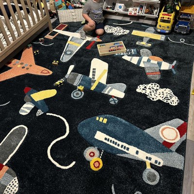 Introducing the vibrant and playful addition to your child's room or play area, our Kids Style Power Loomed Runner Area Rug! Designed with fun and transportation in mind, this 2' x 8' runner rug features an eye catching pattern of various airplanes and helicopters, darting among fluffy clouds on a crisp, black and ivory background that ignites the imagination and brings life to any space.