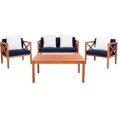 Transform your outdoor space with the stylish Carson 4PC Outdoor Set in Natural and Navy. Crafted from durable wood, this set offers the perfect combination of comfort and design. The natural wood finish enhances the beauty of your garden or patio, while the navy cushions add a touch of elegance.